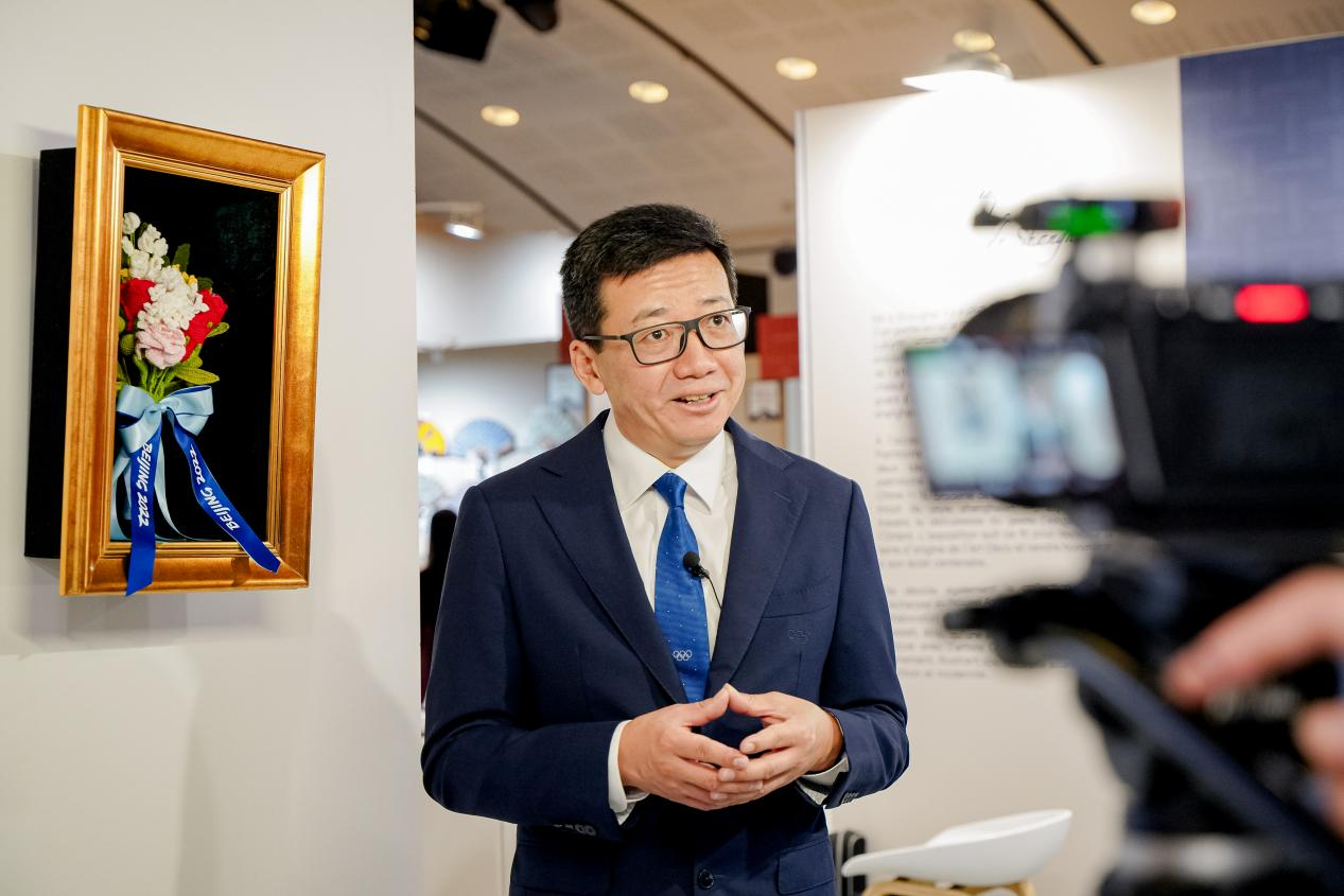同时,陈董向记者介绍了恒源祥与奥运的渊源,讲述了恒源祥运用海派绒线编结技艺为北京2022冬奥会和冬残奥会提供的“永不凋谢的颁奖花束”及其背后的创作故事,认为手工编织不仅提供消费者生活产品,更是一种表达情感和精神的生活方式。他同时介绍了现场展陈中寓意为“中法绒情 恒久无限”的恒源祥国家级非遗海派绒绣精品,及其在中法文化交流中的意义。