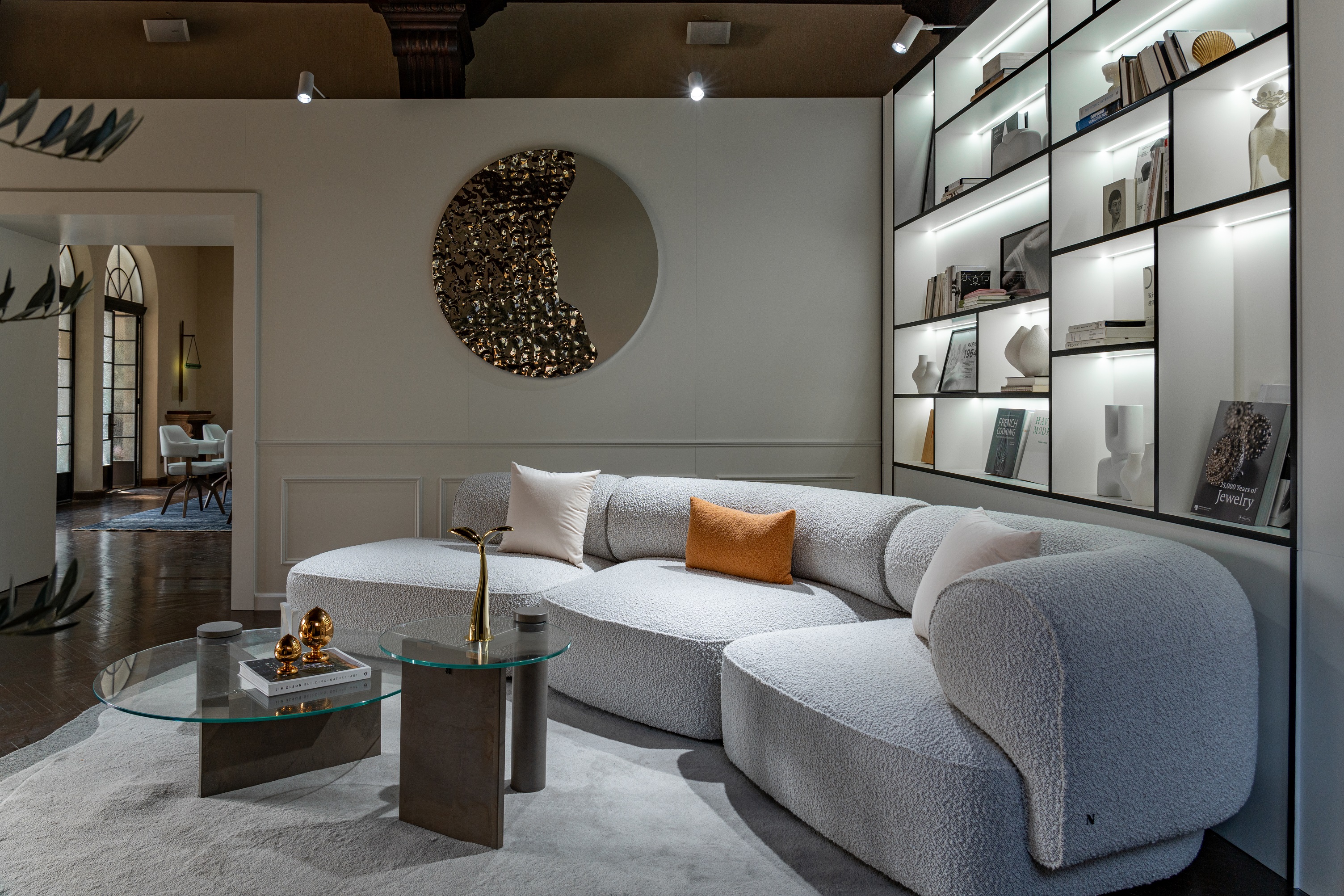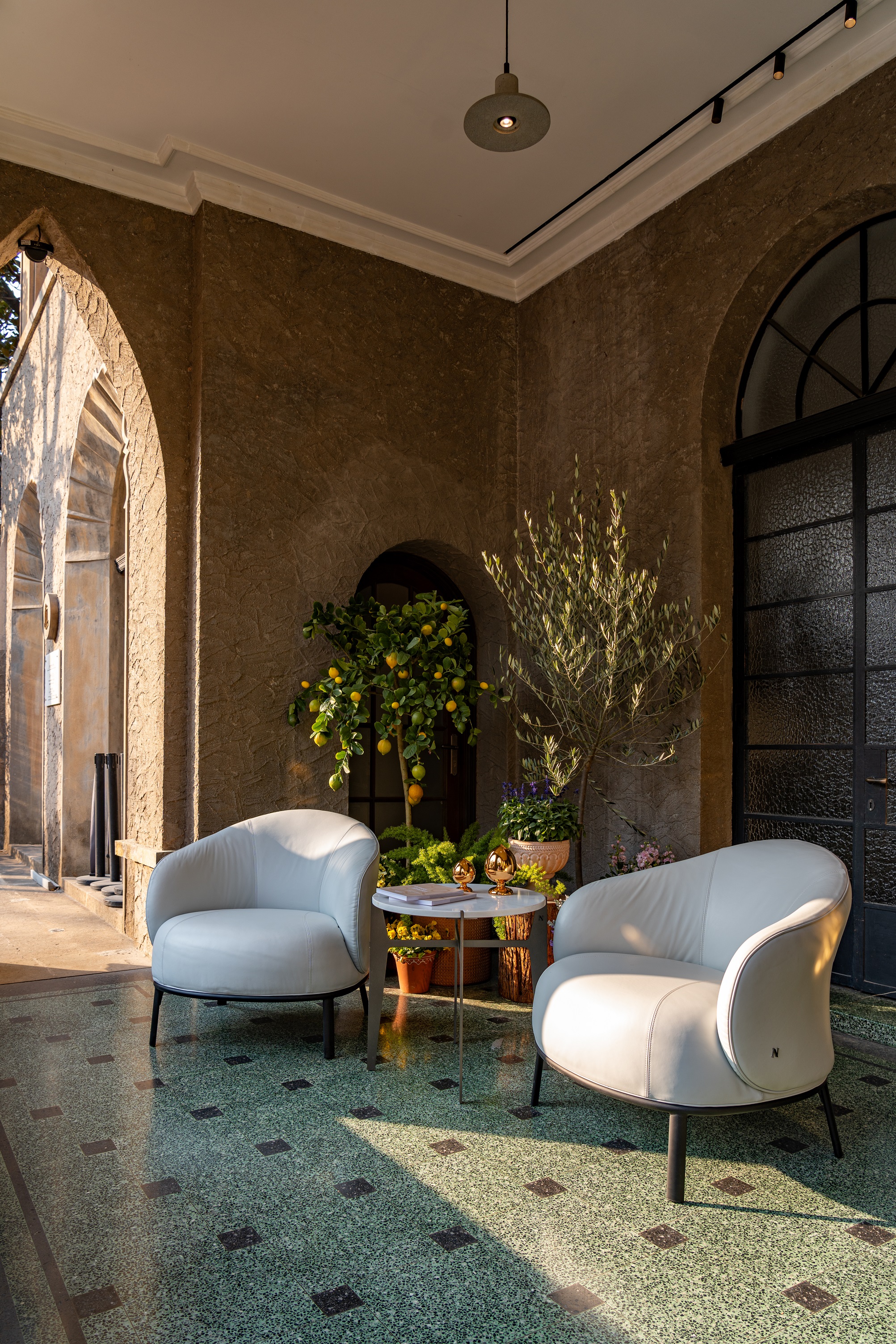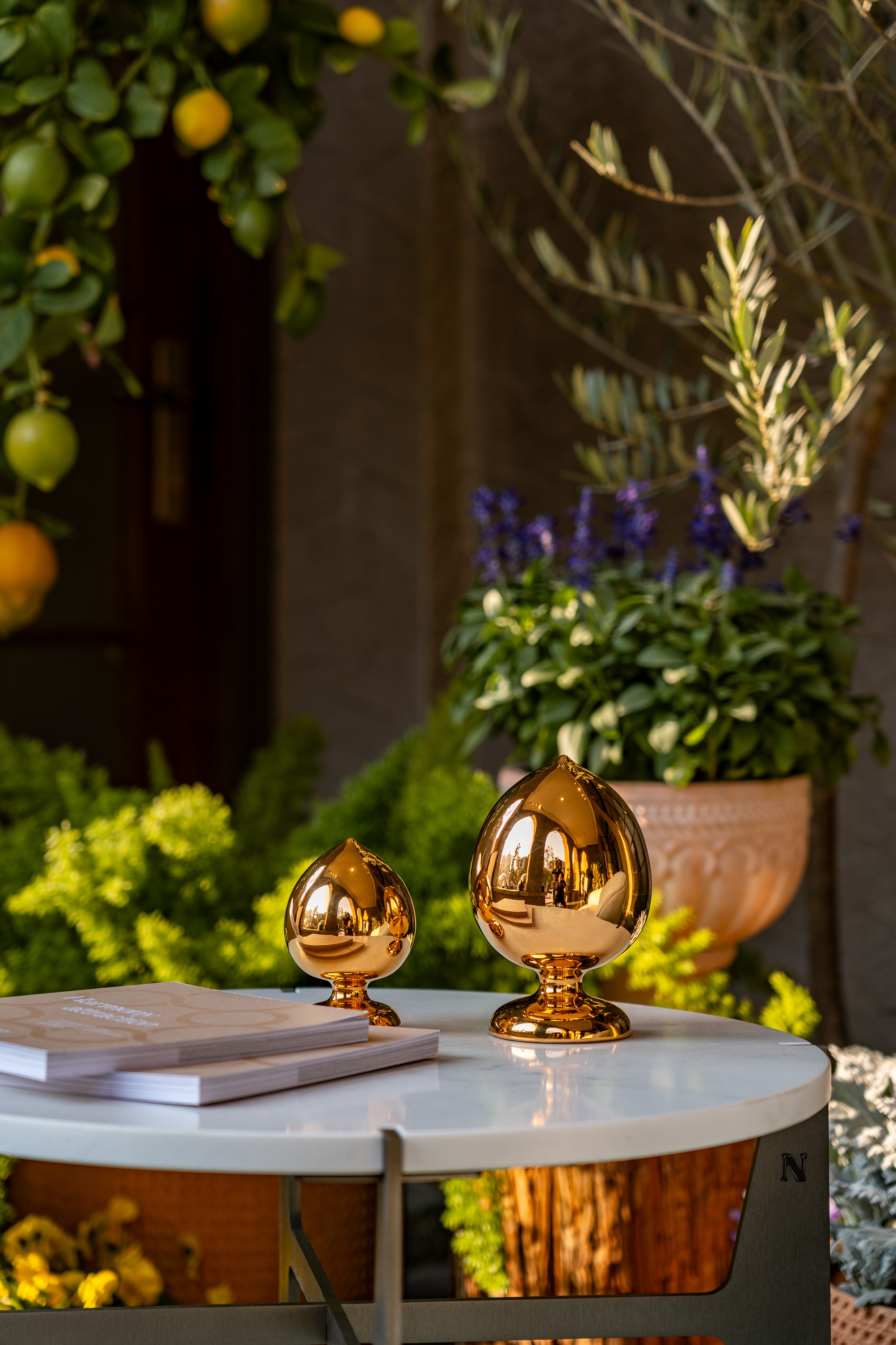 别墅庭院的外廊,翁葱的柑橘与橄榄叶影斑驳,衬其间革面Botanic扶手椅的纯白优雅与曲线灵动;一侧宛若灵动新芽的Germoglio灯盏与饱满松果状的Pumo摆件,轻泛鎏金光芒,巧蕴庆典般浮跃欢欣的盎然氛围。