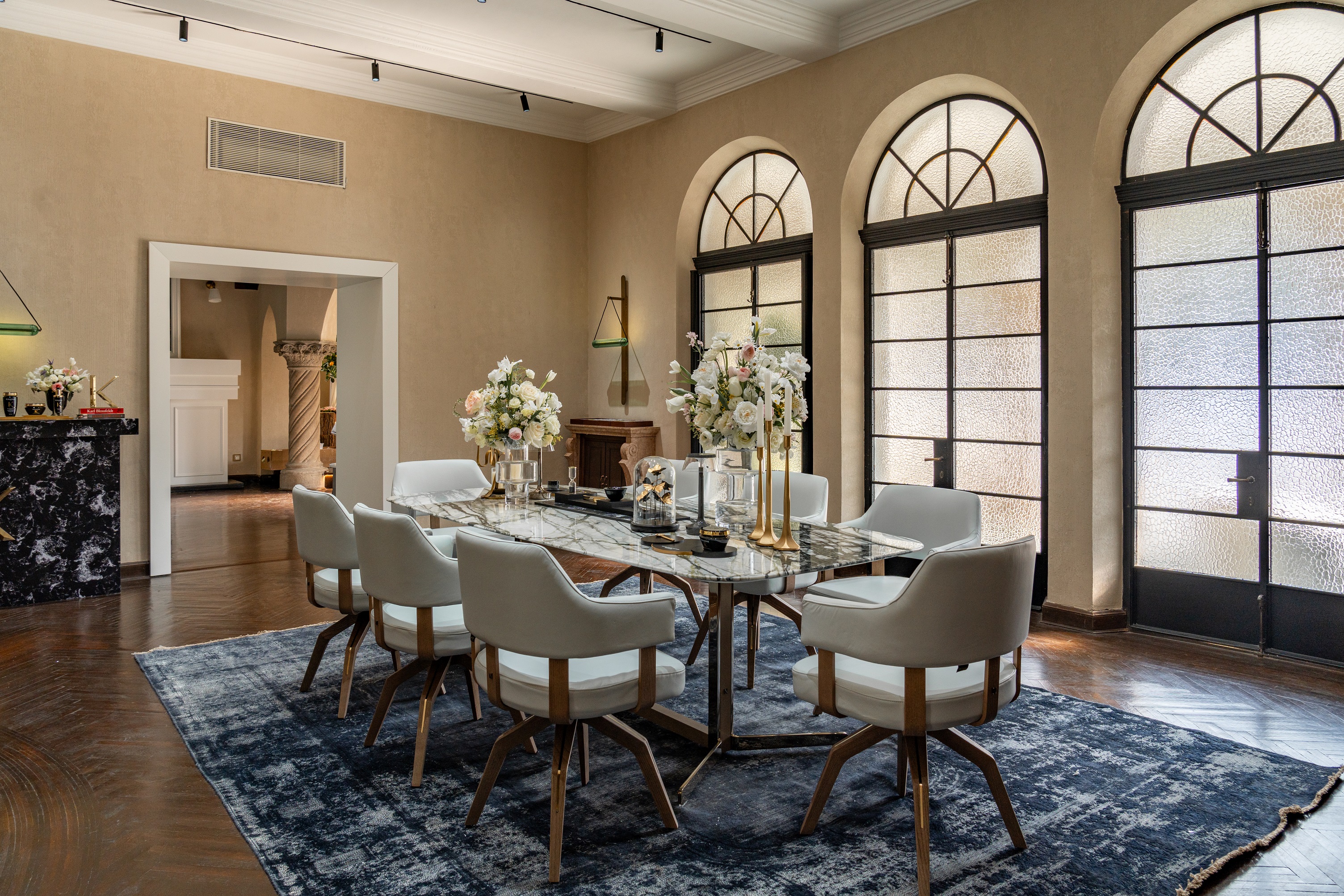 幽蓝水墨纹理的Affresco绒面地毯,清润卡拉卡特绿大理石饰面的Campus餐桌,渲染出色调匀称而充满仪式感的典雅气氛。浅白皮革包裹流畅坐垫和半环合扶手的Valle餐椅,以其利落均匀的胡桃木分岔底座,恰到好处地在充满视觉张力的空间中演绎出沉稳而明朗的平衡之美。