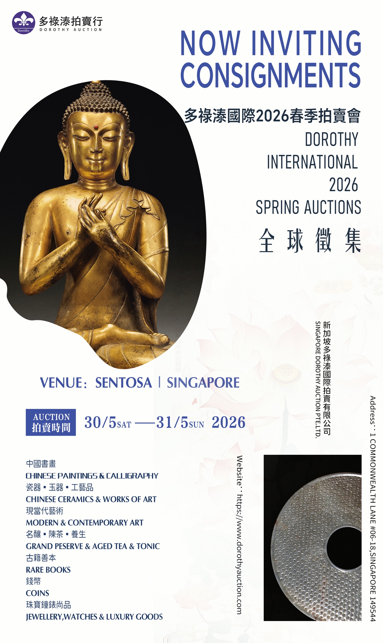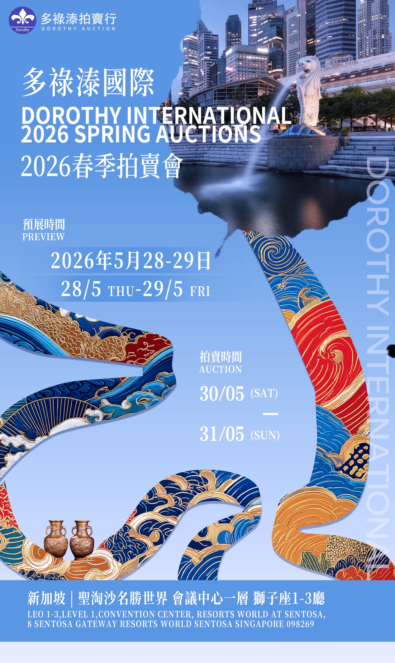 多祿溙拍賣行(DOROTHY AUCTION)通告,**多祿國際2026春季拍賣會(Dorothy International 2026 Spring Auctions)**藏品徵集現已進入最後階段。本季拍賣會將於 2026年5月30日至31日 在新加坡聖淘沙名勝世界會議中心舉行,拍賣預展將於 5月28日至29日 向公衆開放。