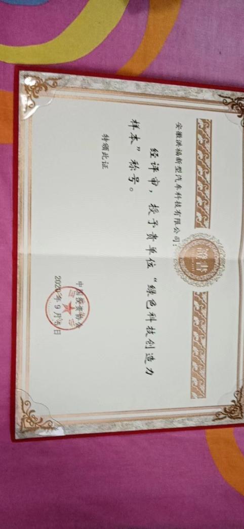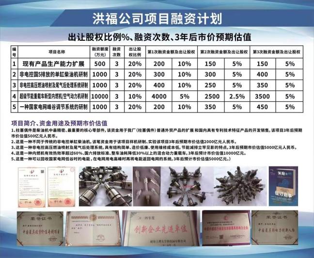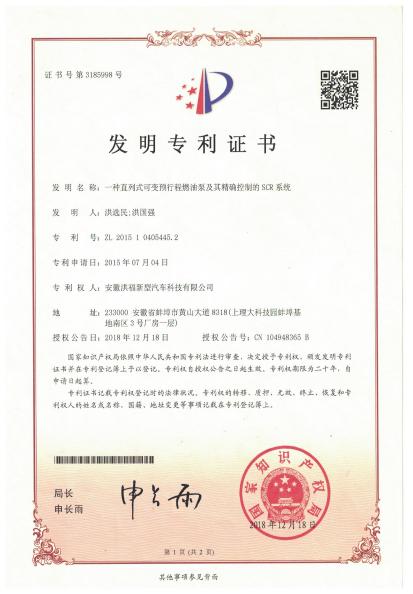 2018.6.成立安徽洪福新能源绿色动力科技有限公司,注册资金500万元,营业范围:可变预行程燃油泵及其精确控制的SCR系统研制、超级节能重载车的研制。