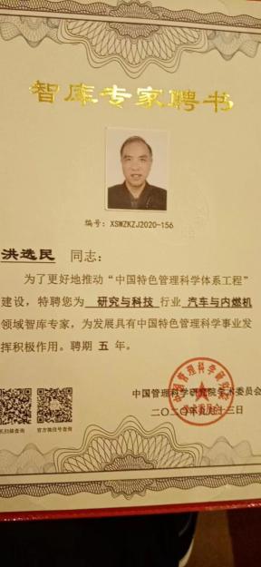 2020.9.洪选民成为中国未来研究会会员,2020.9.13.洪选民应邀成为中国管理科学研究院.研究与科技行业.汽车与内燃机领域智库专家、中国管理科学研究院学术委员会高级研究员。