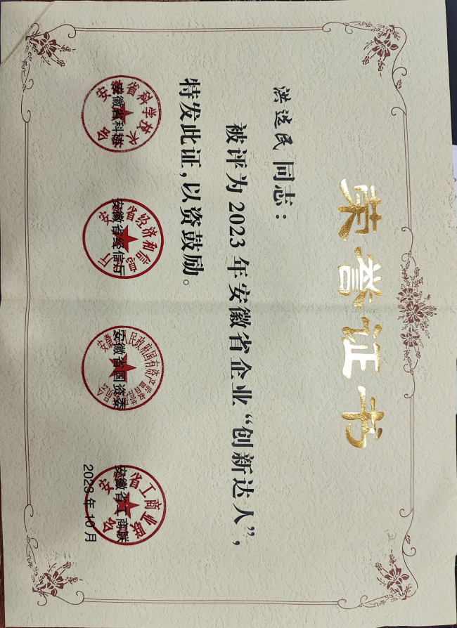 2023.10.安徽省科协、经信厅、国资委、工商联合会共同授予从全省评选的100名企业家为“2023年安徽省企业创新达人”称号,这是对上述企业创新能力的认可,洪选民也名列其中。