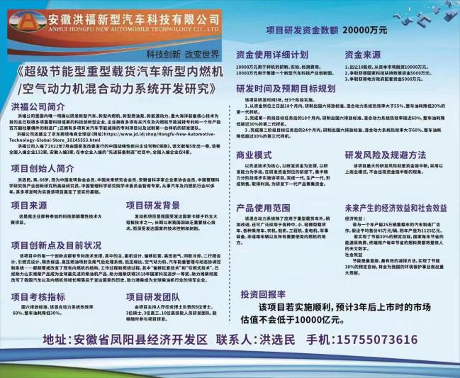 2024.4.18.洪福公司带着五个项目(1.现有产品产能扩展、2.非电控国五排放的单缸柴油机研制、3.非电控高压燃油喷射及尾气后处理系统的研制、4.超级节能重载车的研制,5.一种国家电网峰谷调节系统的研制)参加了凤阳县举办的创新创业大赛,本想借此参赛机会获得政府支持,可笑的是,洪福公司在所有参赛企业中评分垫底……