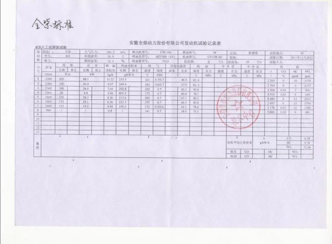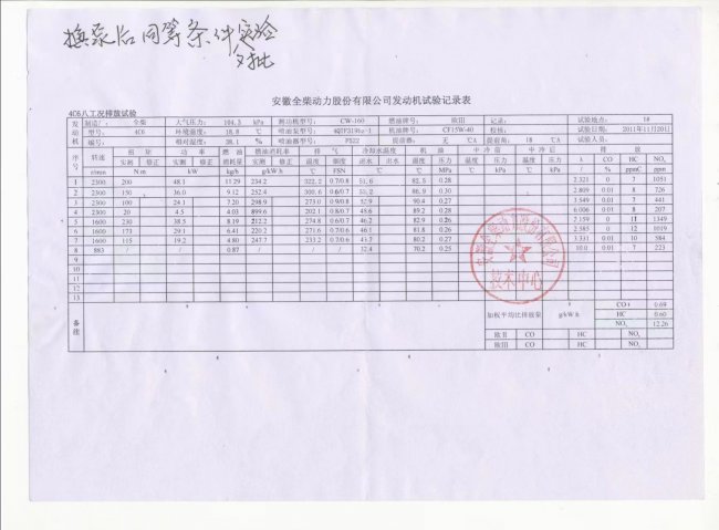 2011.11.20.在安徽全柴技术中心,通过一台498柴油机所做的对比实验数据